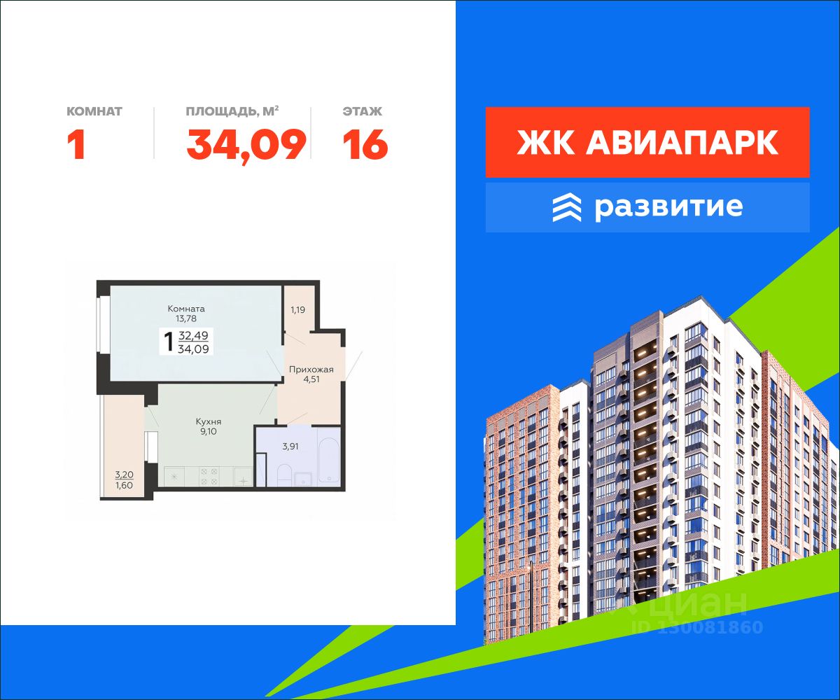 В продаже квартира площадью 34.09 кв. м с отделкой. Квартира расположена на 16 этаже 18 этажного дома, в новом жилом квартале "Авиапарк".