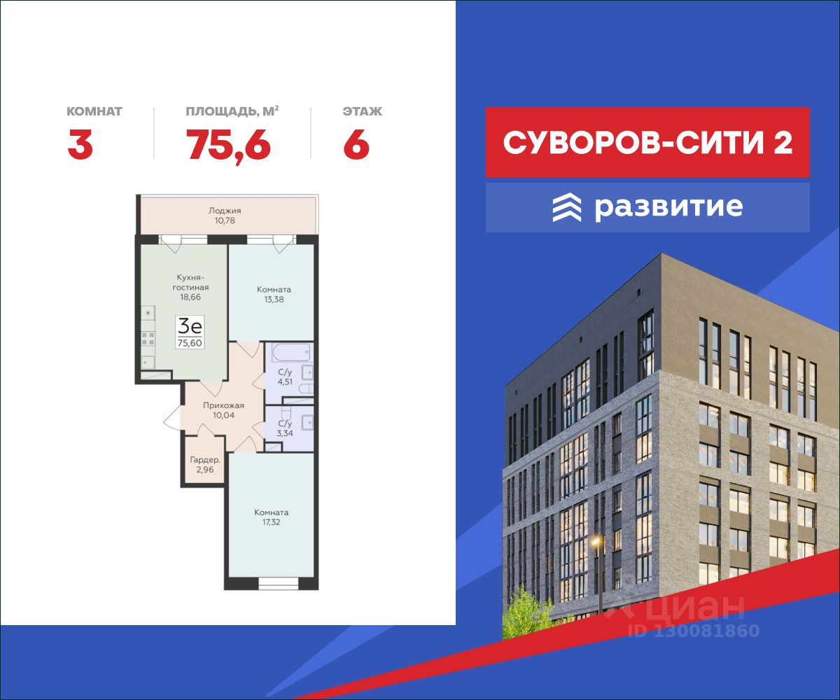 В жилом комплексе, расположенном в 4 километрах от исторического центра Воронежа, продается 3-комнатная квартира площадью 75.60 кв. м с черновой отделкой. Квартира расположена на 6 этаже корпуса 10908586 (ЖК "Суворов Сити 2" (1-й этап, ПОЗИ жилого комплекса комфорт-класса "Суворов Сити II" от федерального застройщика ГК "Развитие".
