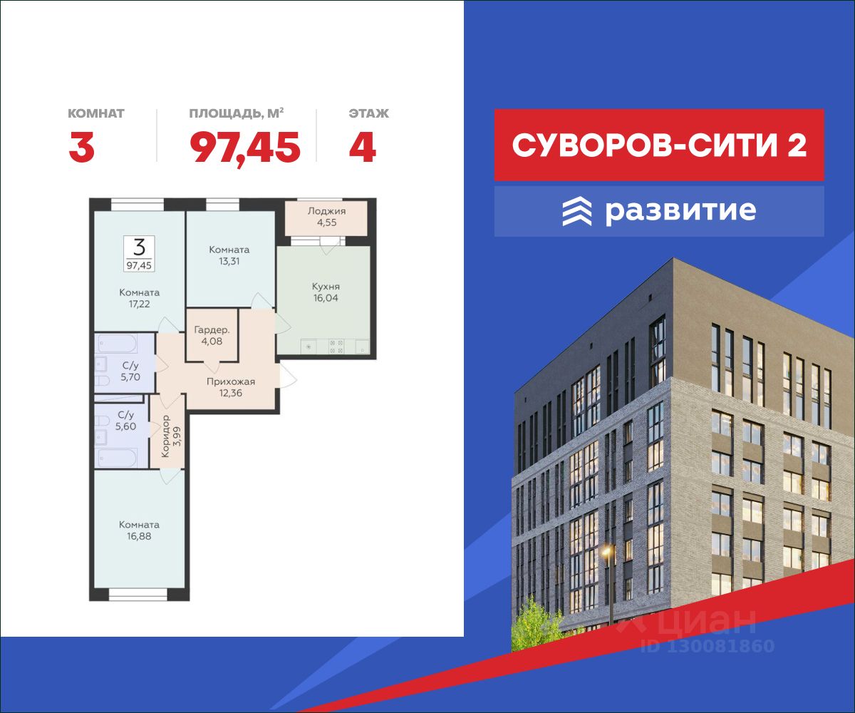В жилом комплексе, расположенном в 4 километрах от исторического центра Воронежа, продается 3-комнатная квартира площадью 97.45 кв. м с черновой отделкой. Квартира расположена на 4 этаже корпуса 10908586 (ЖК "Суворов Сити 2" (1-й этап, ПОЗИ жилого комплекса комфорт-класса "Суворов Сити II" от федерального застройщика ГК "Развитие".
