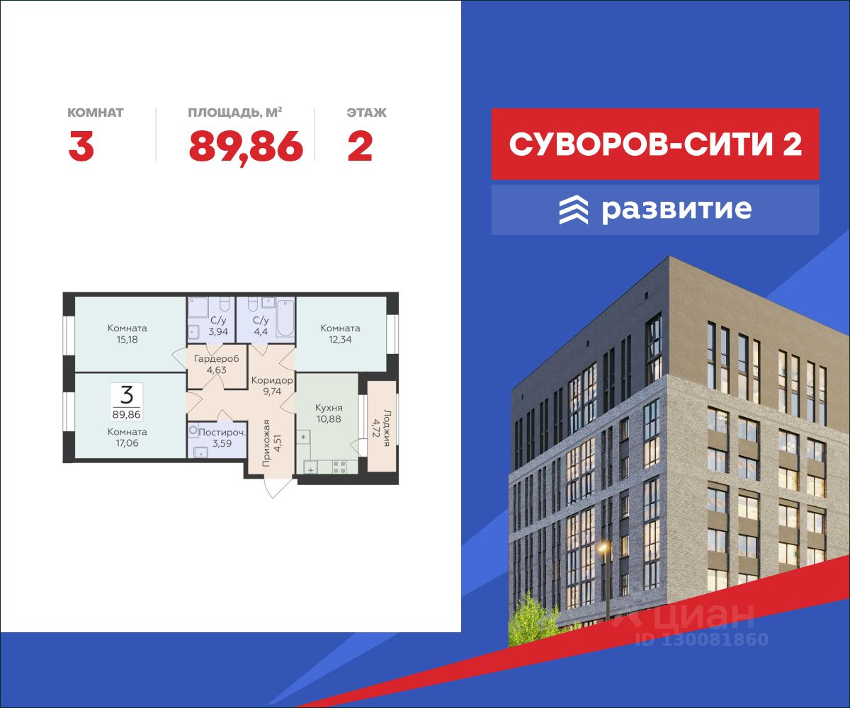 В жилом комплексе, расположенном в 4 километрах от исторического центра Воронежа, продается 3-комнатная квартира площадью 89.86 кв. м с черновой отделкой. Квартира расположена на 2 этаже корпуса 10908586 (ЖК "Суворов Сити 2" (1-й этап, ПОЗИ жилого комплекса комфорт-класса "Суворов Сити II" от федерального застройщика ГК "Развитие".