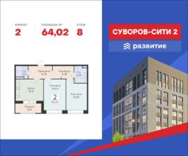 В жилом комплексе, расположенном в 4 километрах от исторического центра Воронежа, продается 2-комнатная квартира площадью 64.02 кв. м с черновой отделкой. Квартира расположена на 8 этаже корпуса 10908586 (ЖК "Суворов Сити 2" (1-й этап, ПОЗИ жилого комплекса комфорт-класса "Суворов Сити II" от федерального застройщика ГК "Развитие".