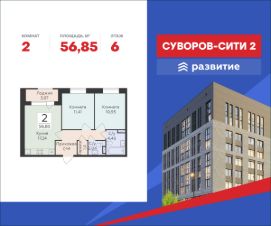 В жилом комплексе, расположенном в 4 километрах от исторического центра Воронежа, продается 2-комнатная квартира площадью 56.85 кв. м с черновой отделкой. Квартира расположена на 6 этаже корпуса 10908586 (ЖК "Суворов Сити 2" (1-й этап, ПОЗИ жилого комплекса комфорт-класса "Суворов Сити II" от федерального застройщика ГК "Развитие".
