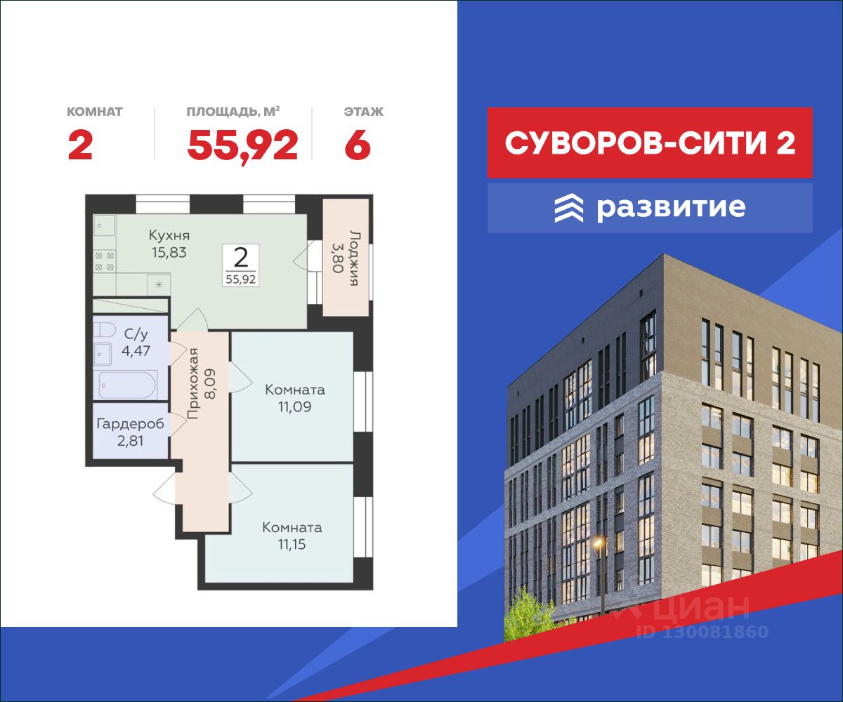 В жилом комплексе, расположенном в 4 километрах от исторического центра Воронежа, продается 2-комнатная квартира площадью 55.92 кв. м с черновой отделкой. Квартира расположена на 6 этаже корпуса 10908586 (ЖК "Суворов Сити 2" (1-й этап, ПОЗИ жилого комплекса комфорт-класса "Суворов Сити II" от федерального застройщика ГК "Развитие".
