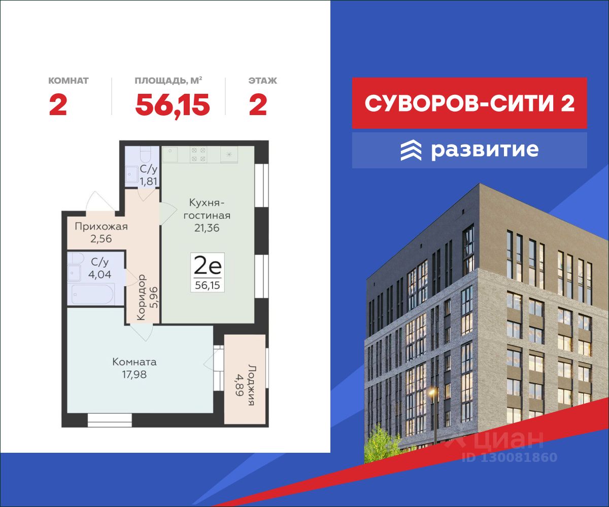 В жилом комплексе, расположенном в 4 километрах от исторического центра Воронежа, продается 2-комнатная квартира площадью 56.15 кв. м с черновой отделкой. Квартира расположена на 2 этаже корпуса 10908586 (ЖК "Суворов Сити 2" (1-й этап, ПОЗИ жилого комплекса комфорт-класса "Суворов Сити II" от федерального застройщика ГК "Развитие".