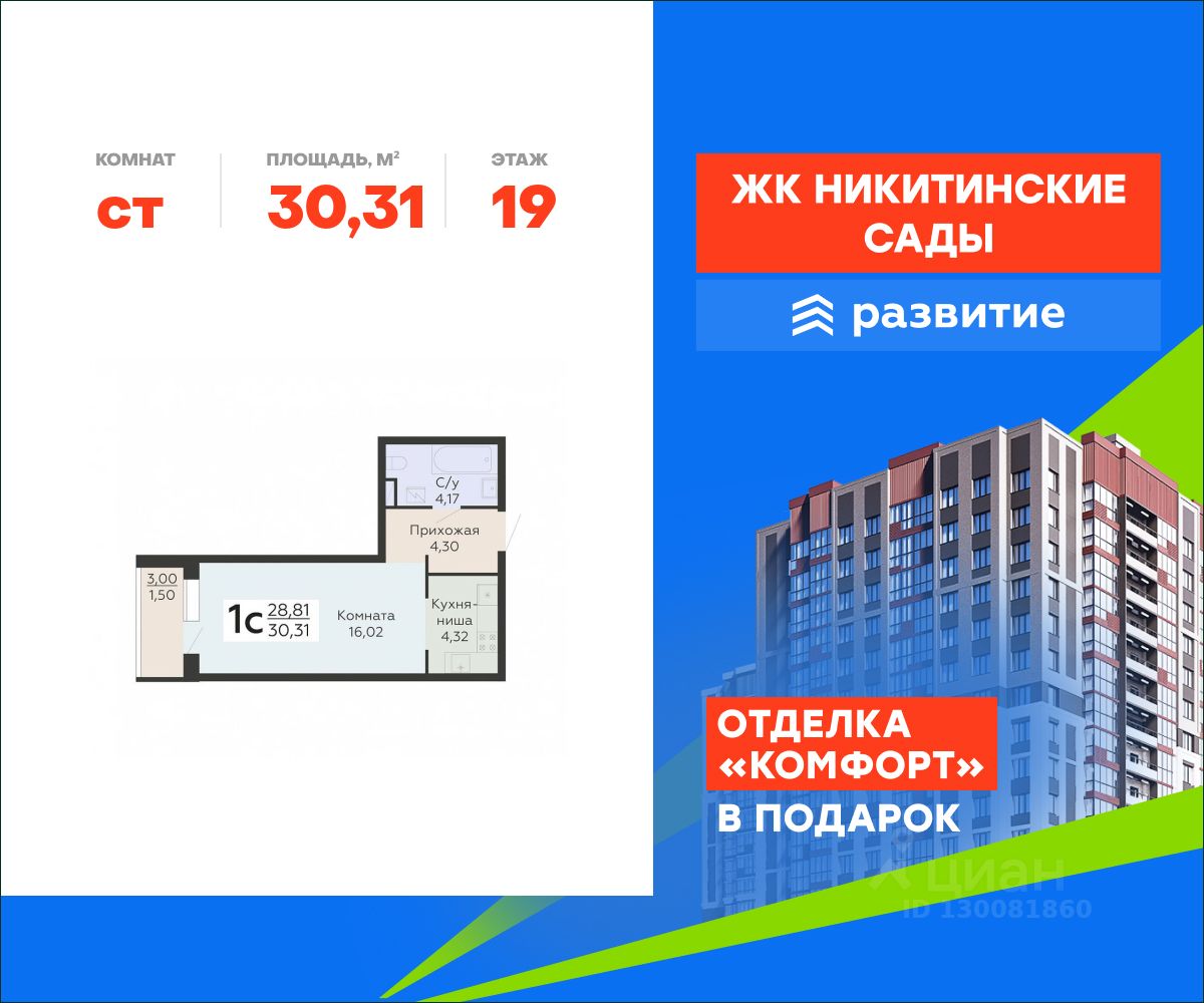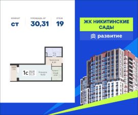 В продаже квартира площадью 30.31 кв. м с отделкой. Квартира расположена на 19 этаже 20 этажного дома, в жилом комплексе комфорт-класса "Никитинские сады".