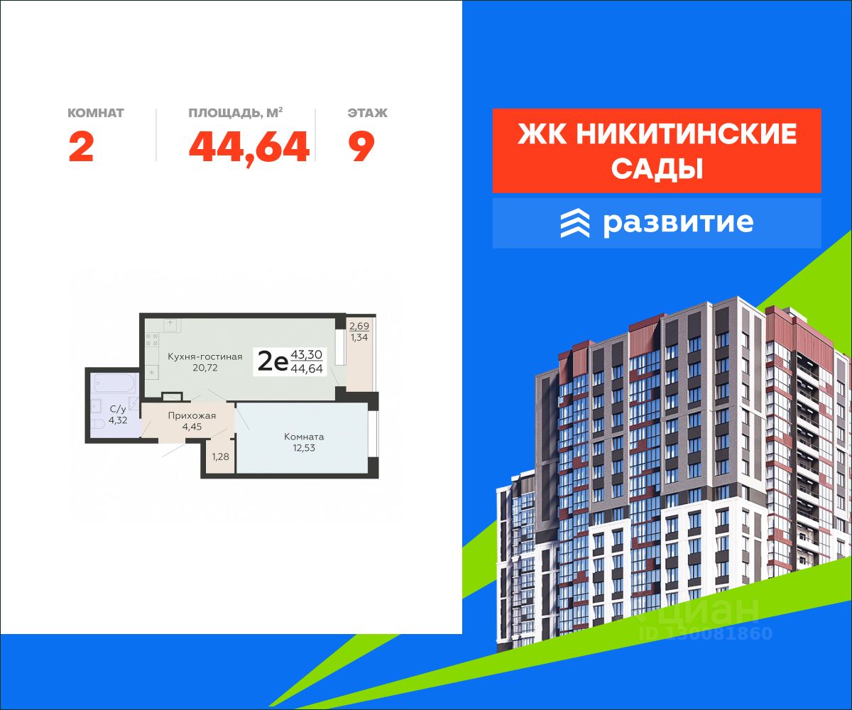 В продаже квартира площадью 44.64 кв. м с черновой отделкой. Квартира расположена на 9 этаже 20 этажного дома, в жилом комплексе комфорт-класса "Никитинские сады".