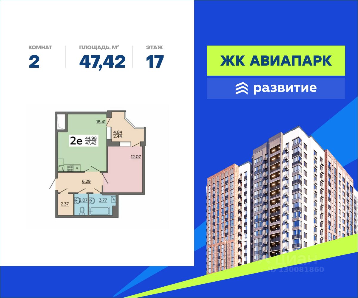 В продаже квартира площадью 47.42 кв. м с отделкой. Квартира расположена на 17 этаже 18 этажного дома, в новом жилом квартале "Авиапарк".