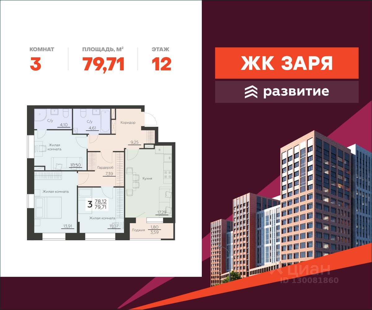 В продаже квартира площадью 79.71 кв. м с черновой отделкой. Квартира расположена на 12 этаже 14 этажного дома, в новом жилом комплексе "Заря" от федерального девелопера "Развитие".