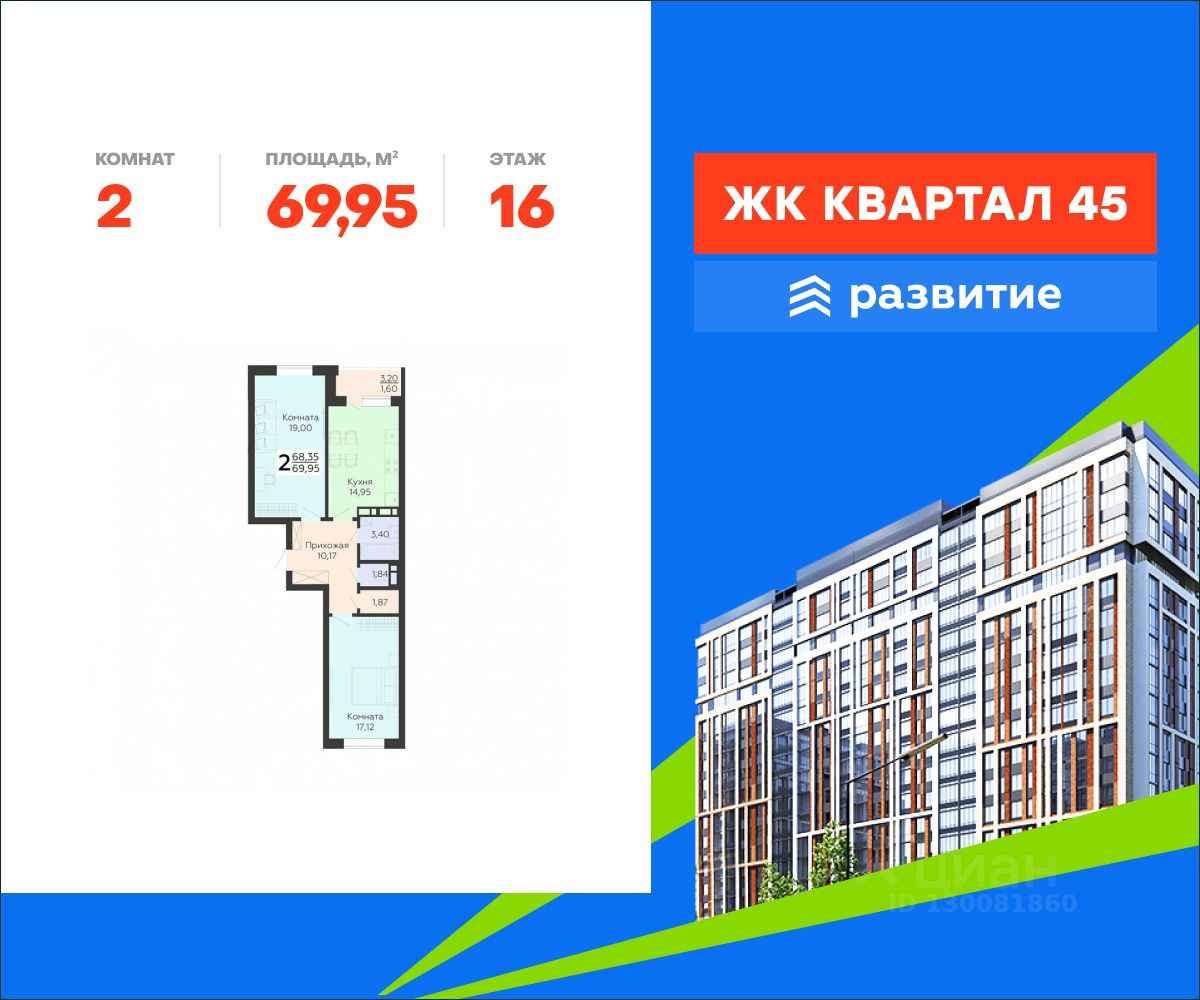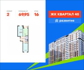 В продаже квартира площадью 69.95 кв. м с черновой отделкой отделкой. Квартира расположена на 16 этаже 18 этажного дома, в жилом комплексе комфорт-класса "Квартал 45".