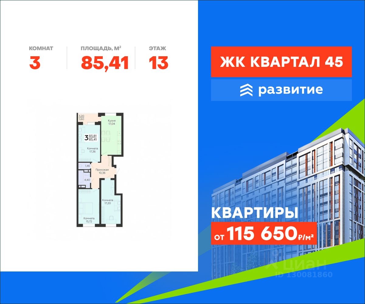 В продаже квартира площадью 85.41 кв. м с черновой отделкой. Квартира расположена на 13 этаже 18 этажного дома, в жилом комплексе комфорт-класса "Квартал 45".
