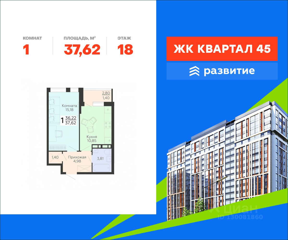 В продаже квартира площадью 37.62 кв. м с черновой отделкой. Квартира расположена на 18 этаже 18 этажного дома, в жилом комплексе комфорт-класса "Квартал 45".