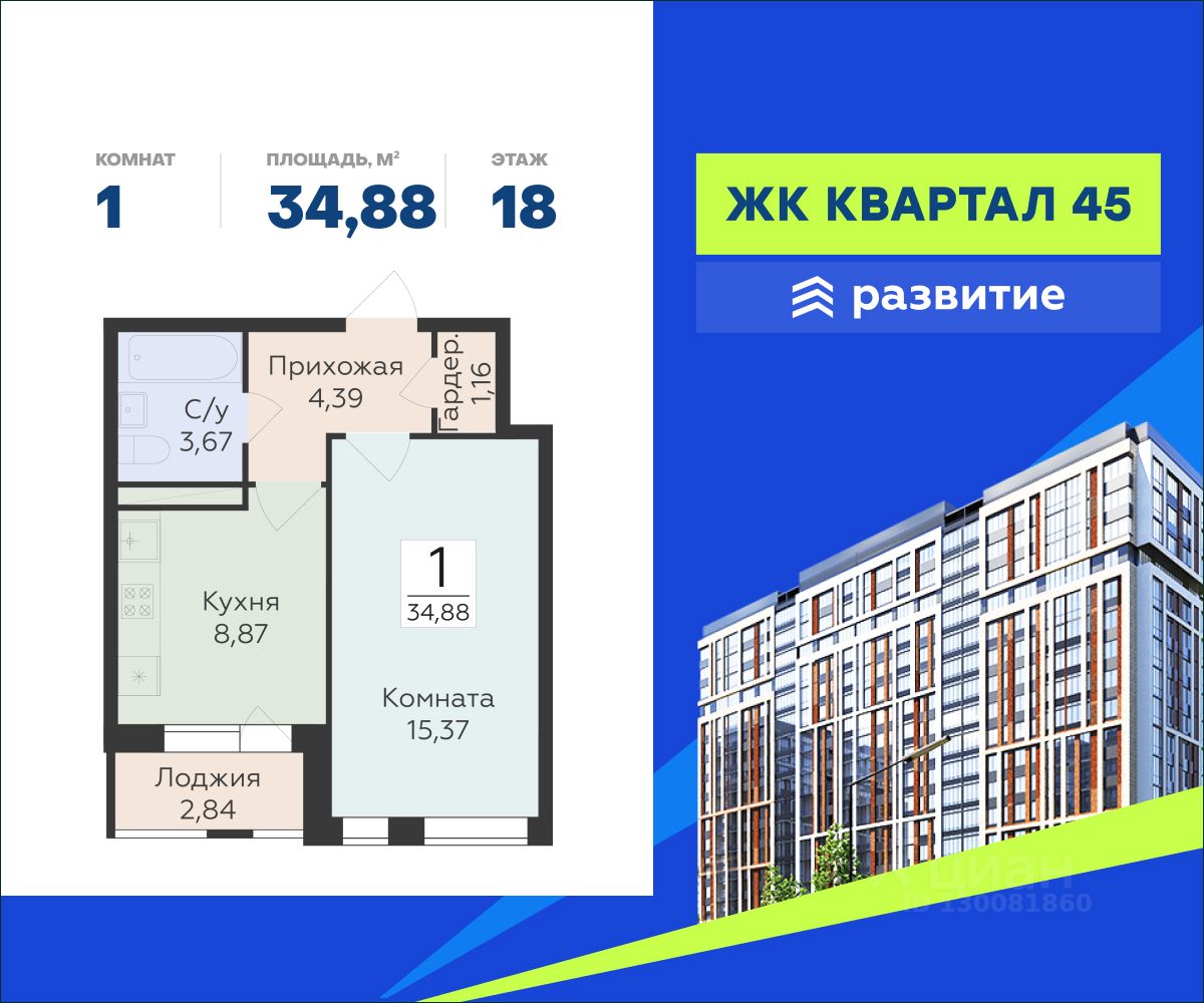 В продаже квартира площадью 34.88 кв. м с черновой отделкой отделкой. Квартира расположена на 18 этаже 18 этажного дома, в жилом комплексе комфорт-класса "Квартал 45".
