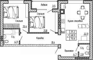 Продаётся 2-комнатная квартира в строящемся доме (Генерала Бакланова, 1 (Поз. 2)), срок сдачи: I-кв. 2026, общей площадью 70.6 кв.м., на 1 этаже. Жилой комплекс "Дон" расположен в селе Ямное Рамонского района Воронежской области, на расстоянии 10 км от города, в живописном экологически благоприятном месте в окружении лесного массива рядом с рекой Дон.