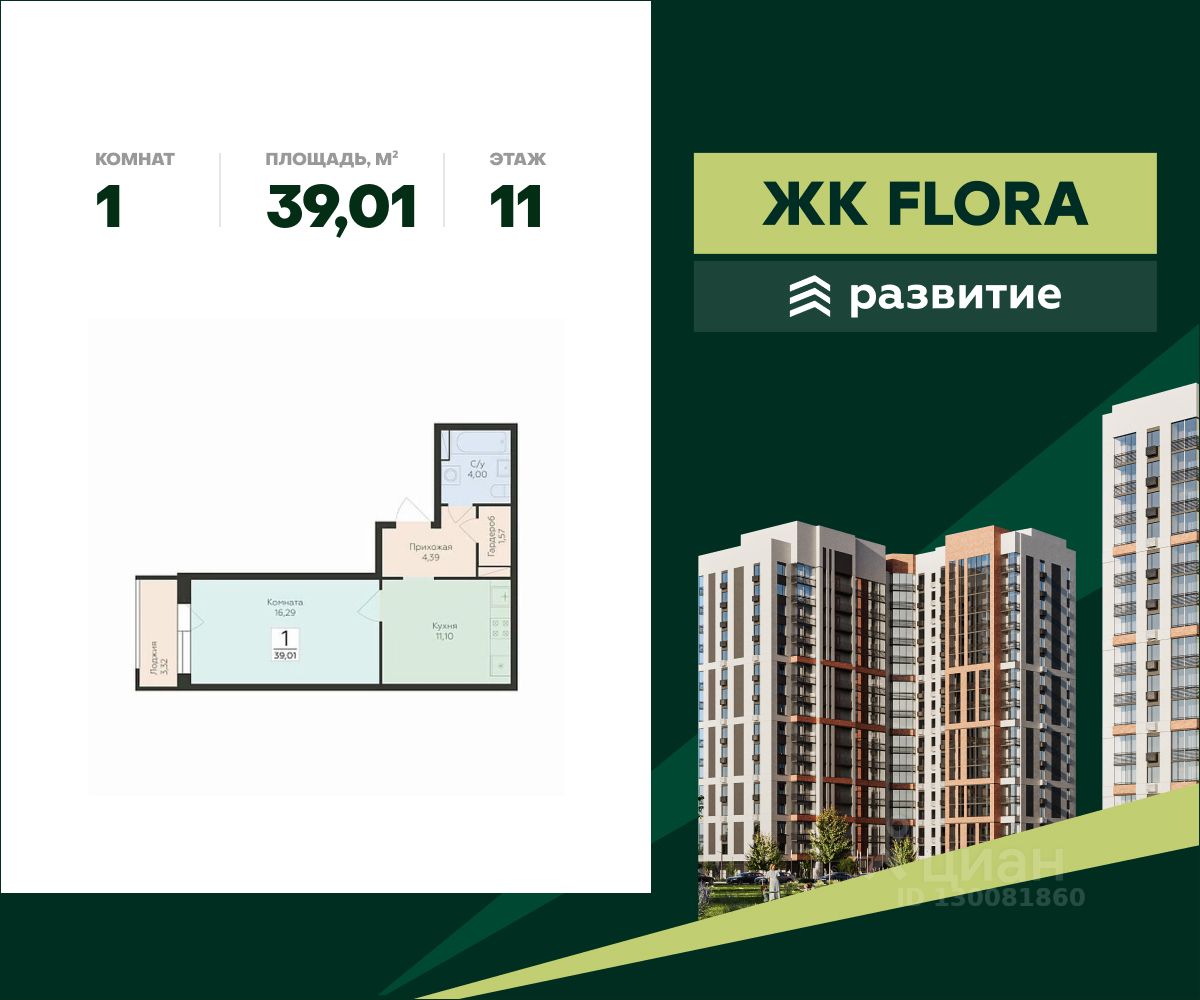 В продаже квартира площадью 39.01 кв. м с отделкой. Квартира расположена на 11 этаже 17 этажного дома, в жилом комплексе комфорт-класса FLORA ("Флора").