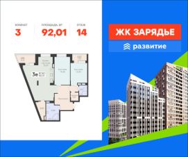 В продаже квартира площадью 92.01 кв. м с черновой отделкой. Квартира расположена на 14 этаже 18 этажного дома, в новом микрорайоне комфорт-класса "Зарядье" (Девелопер - ГК "Развитие").