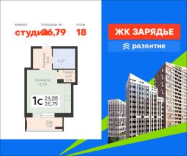 В продаже квартира площадью 26.79 кв. м с черновой отделкой. Квартира расположена на 18 этаже 23 этажного дома, в новом микрорайоне комфорт-класса "Зарядье" (Девелопер - ГК "Развитие").