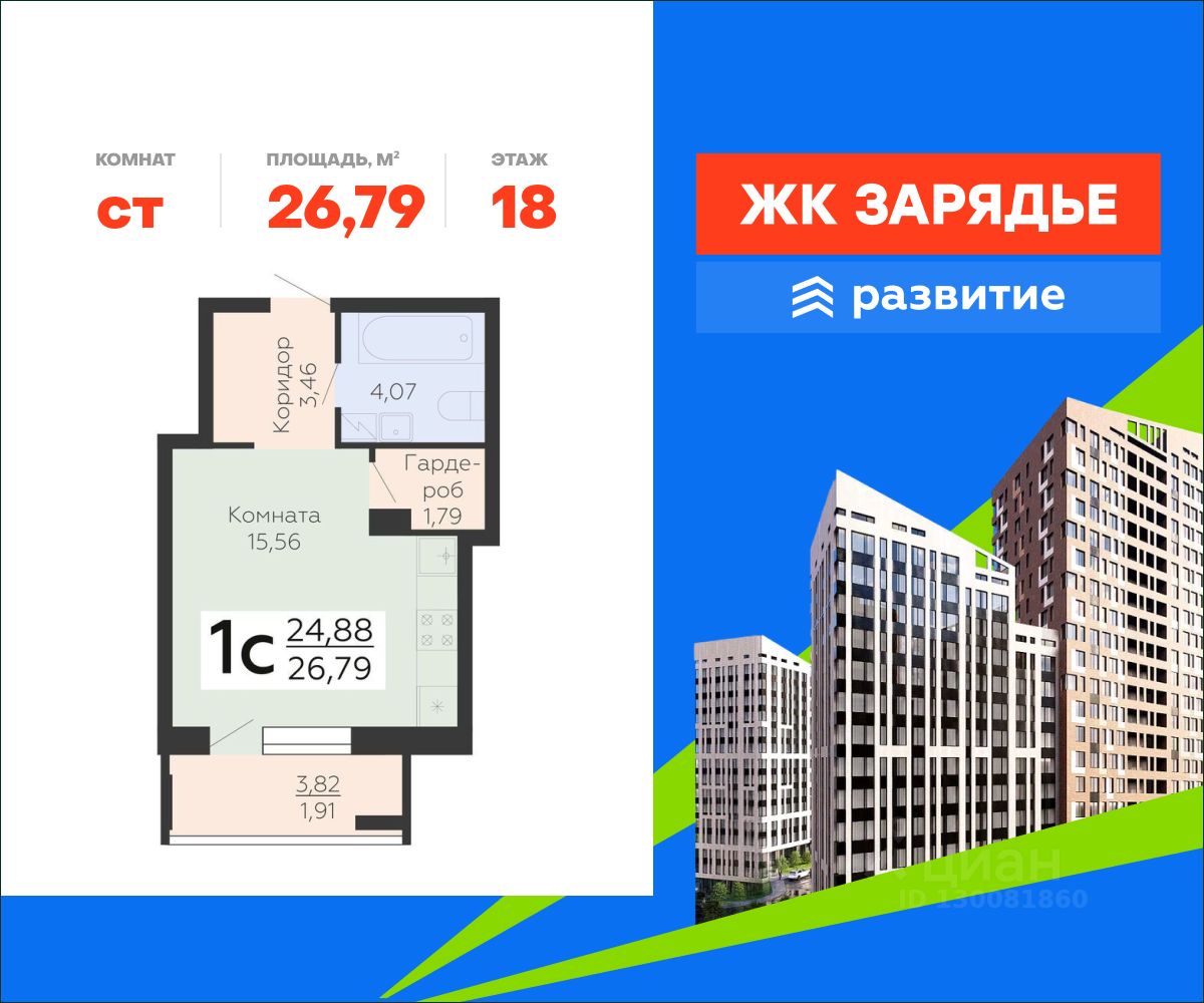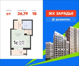 В продаже квартира площадью 26.79 кв. м с черновой отделкой. Квартира расположена на 18 этаже 23 этажного дома, в новом микрорайоне комфорт-класса "Зарядье" (Девелопер - федеральный застройщик ГК "Развитие").