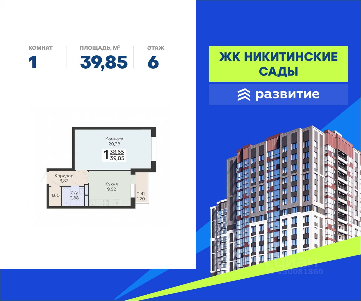 В продаже квартира площадью 39.85 кв. м с отделкой. Квартира расположена на 6 этаже 20 этажного дома, в жилом комплексе комфорт-класса "Никитинские сады".