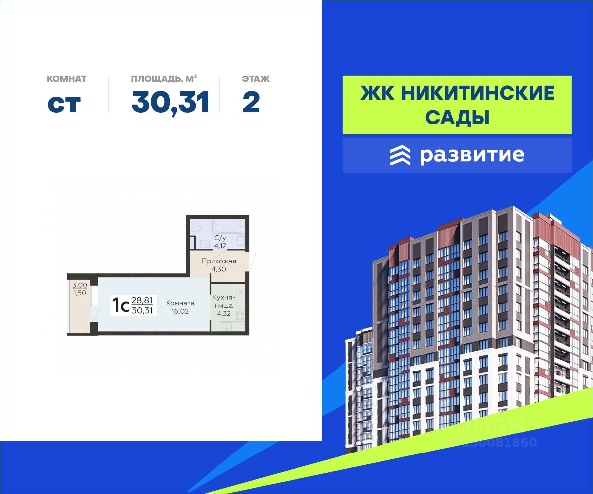 В продаже квартира площадью 30.31 кв. м с черновой отделкой. Квартира расположена на 2 этаже 20 этажного дома, в жилом комплексе комфорт-класса "Никитинские сады".