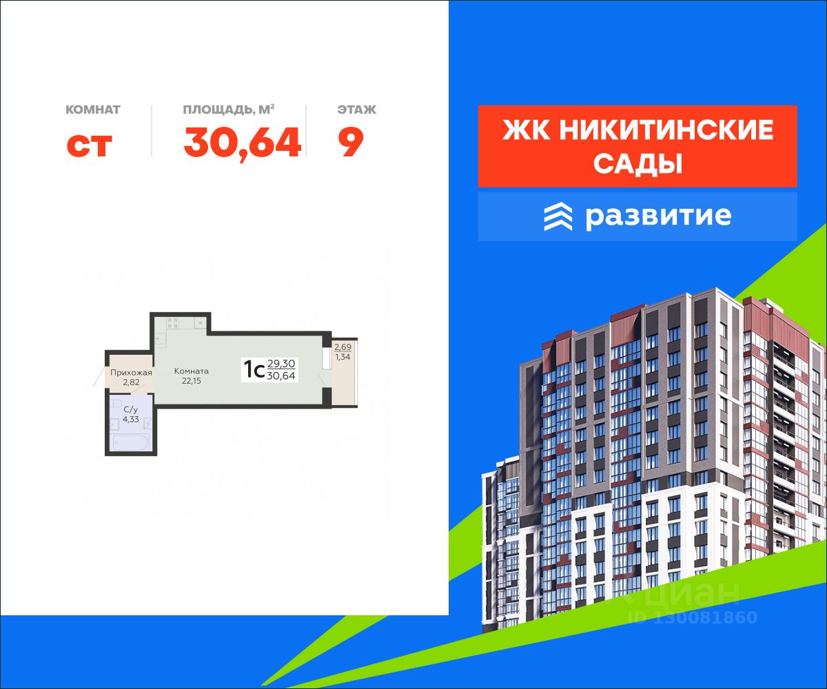 В продаже квартира площадью 30.64 кв. м с черновой отделкой. Квартира расположена на 9 этаже 20 этажного дома, в жилом комплексе комфорт-класса "Никитинские сады".