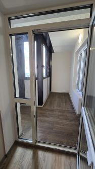 - межкомнатные двери в цвет ламината с металлическими ручками,