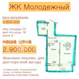 Площадь 36 кв.м с правильной, удобной формой комнаты 16 кв.м