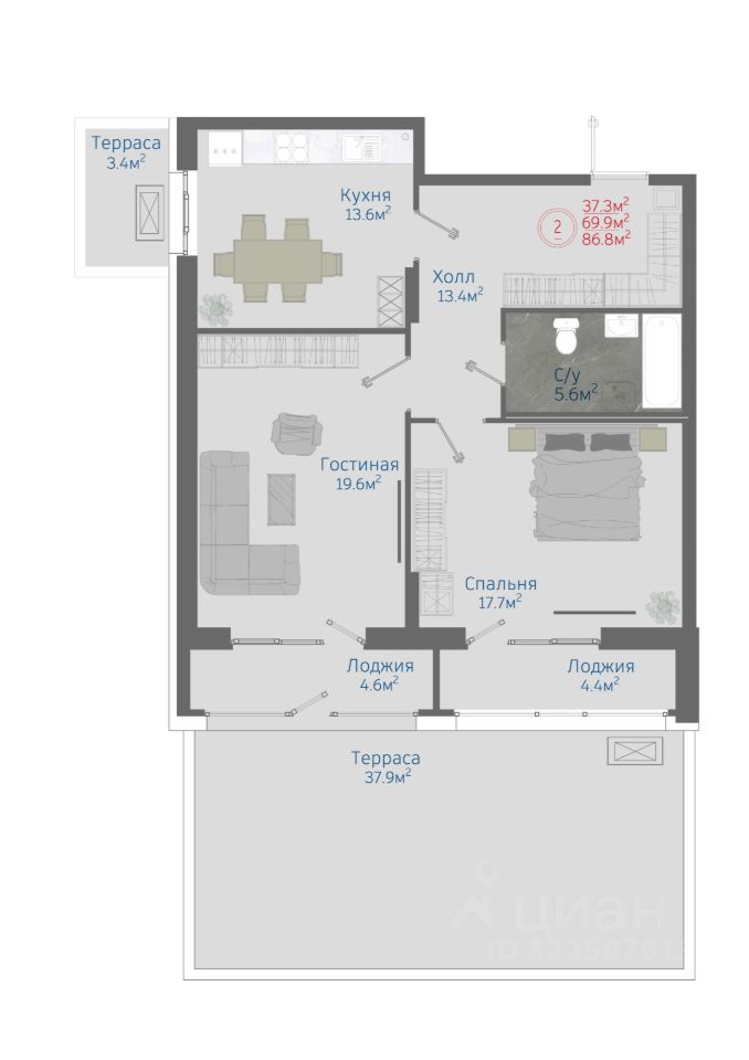 Великолепная планировка с функциональным большим холлом, удобными просторными спальнями, двумя санузлами. Выход на лоджию комфортно располагается из большой кухни-гостиной., ПСК 4.6%19.9%.