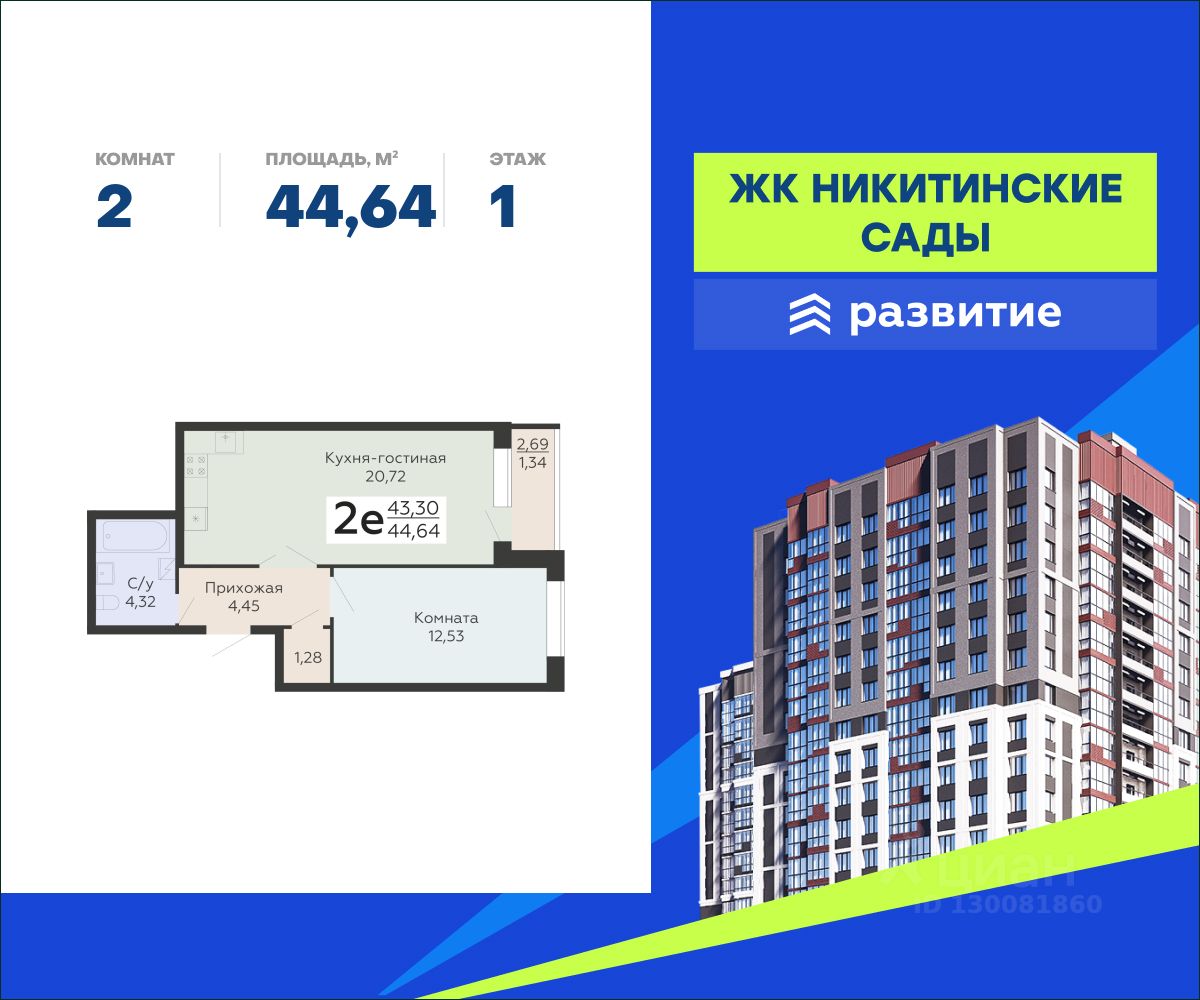 В продаже квартира площадью 44.64 кв. м с отделкой. Квартира расположена на 1 этаже 20 этажного дома, в жилом комплексе комфорт-класса "Никитинские сады".