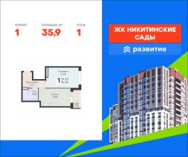 В продаже квартира площадью 35.90 кв. м с черновой отделкой. Квартира расположена на 1 этаже 20 этажного дома, в жилом комплексе комфорт-класса "Никитинские сады".