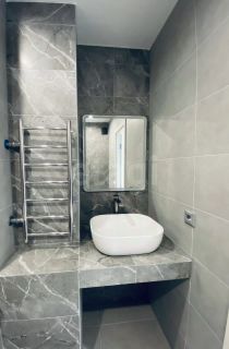 B отделке было выполнено: стены отделаны декоративной штукатуркой, на полу ламинат и по всему периметру дюрополимеровый плинтус, матовый натяжной потолок выполнен одним полотном по все квартире со скрытыми карнизами, установлены спотовые светильники, ванная комната отделана керамогранитом , унитаз с инсталляцией, раковина установлена на встроенной столешнице, хорошая сантехника, дверь из натурального шпона ясеня, пол лоджии отделан керамогранитом