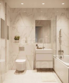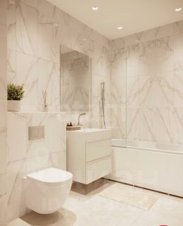 - В туалете и ванной комнате установлено сантехническое оборудование: акриловая ванна белого цвета с декоративным экраном со смесителем, керамический умывальник белого цвета с тумбой и керамический унитаз белого цвета;
