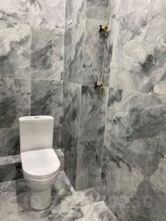 Санузел облицован керамогранитом и качественной стильной сантехникой