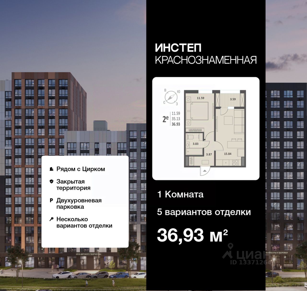 Просторная однокомнатная квартира в ЖК "Инстеп. Краснознаменная" на 17 этаже. Квартира без отделки, полностью готова к ремонту. Общая площадь: 36.93 кв.м., жилая: 11.59 кв.м., площадь просторной кухни-столовой: 15.84 кв.м. Все окна выходят на одну сторону. В квартире одна лоджия, один совмещенный санузел. Высота потолков 2.64 м.