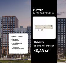 1-комн. квартира от застройщика в ЖК "Инстеп. Краснознаменная" на 18 этаже. Квартира без отделки, новый собственник может сделать ремонт по своему дизайн-проекту. Общая площадь: 49.38 кв.м., жилая: 15.68 кв.м., площадь просторной кухни-столовой: 18.18 кв.м. Квартира - распашонка, без проходных комнат, окна выходят на paзные стороны дома. В квартире одна лоджия, один совмещенный санузел. Высота потолков 2.64 м.