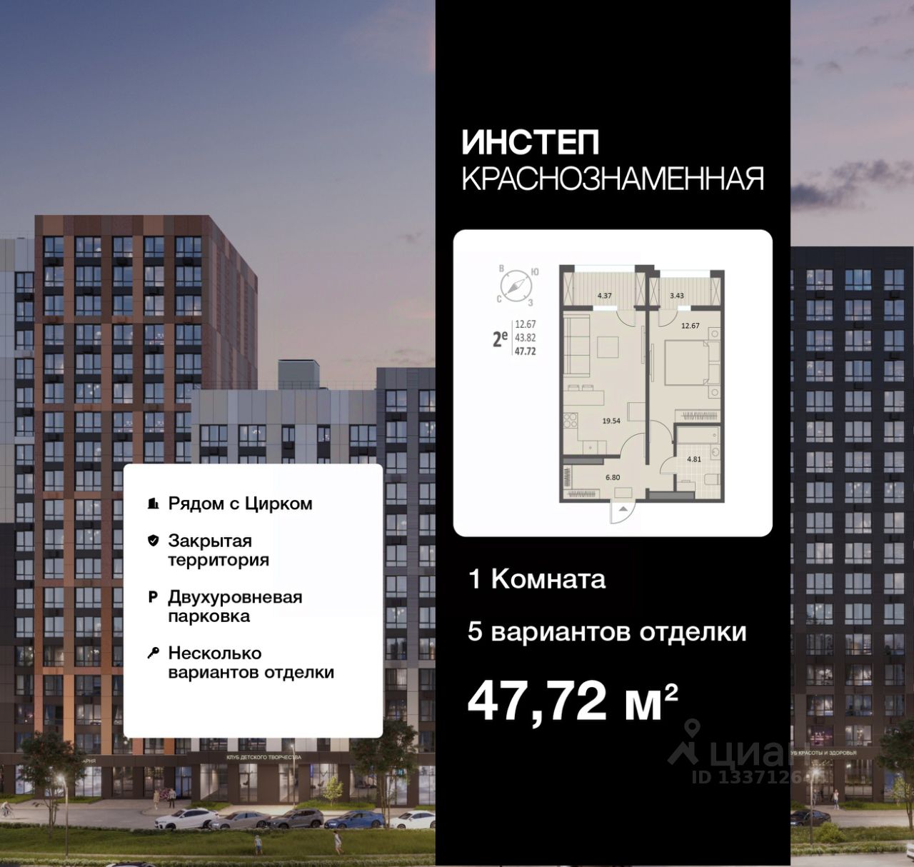 Продается однокомнатная квартира в ЖК "Инстеп. Краснознаменная" на 18 этаже. Квартира без отделки, новый собственник может сделать ремонт по индивидуальному проекту. Общая площадь: 47.72 кв.м., жилая: 12.67 кв.м., площадь просторной кухни-столовой: 19.54 кв.м. Все окна выходят на одну сторону. В квартире две лоджии, один совмещенный санузел. Высота потолков 2.64 м.