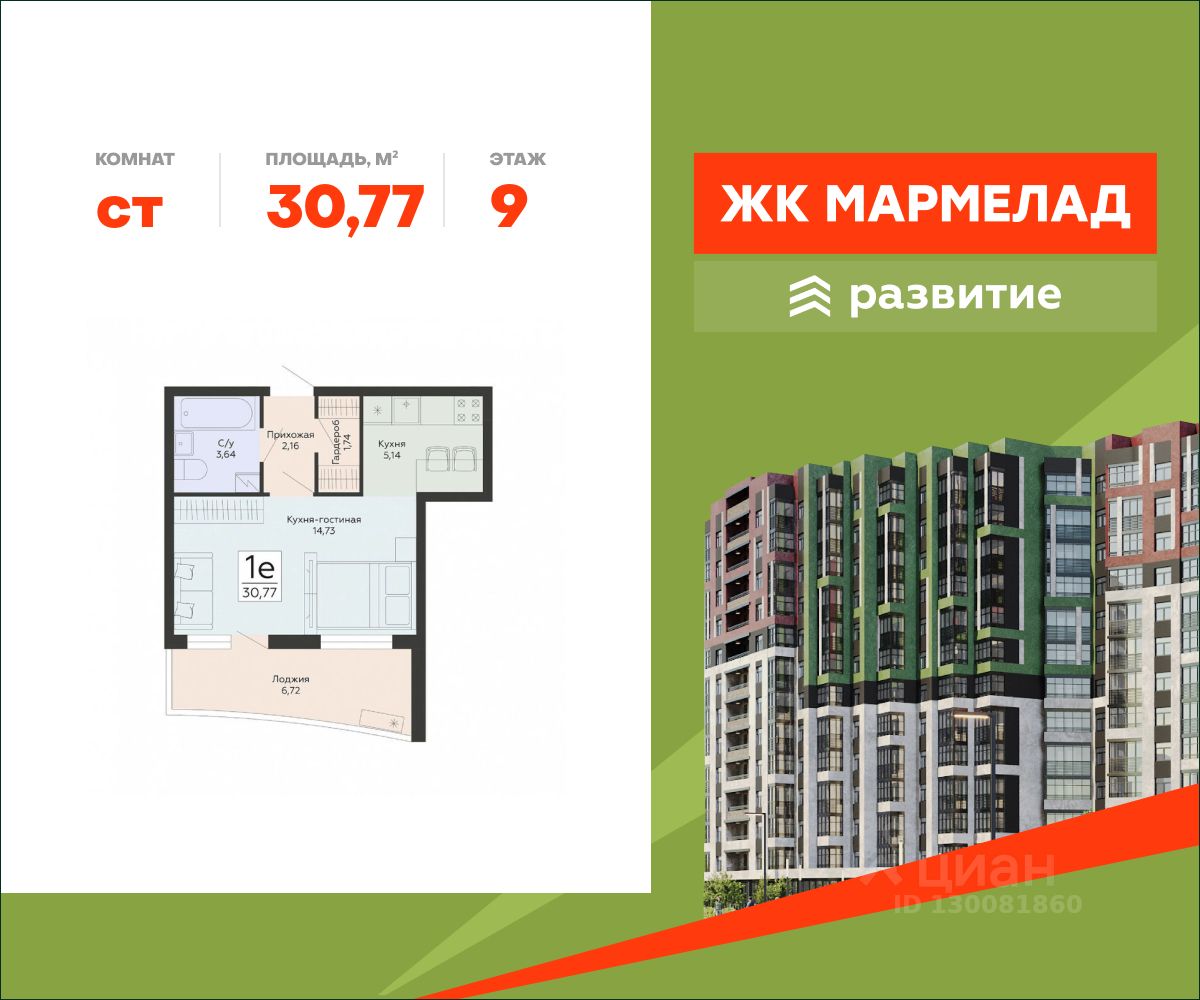 В продаже квартира площадью 30.77 кв. м с черновой отделкой. Квартира расположена на 9 этаже 13 этажного дома, в жилом комплексе комфорт-класса "Мармелад" (Федеральный застройщик - ГК "Развитие").