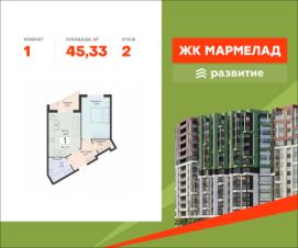 В продаже квартира площадью 45.33 кв. м с черновой отделкой. Квартира расположена на 2 этаже 13 этажного дома, в жилом комплексе комфорт-класса "Мармелад" (Федеральный застройщик - ГК "Развитие").