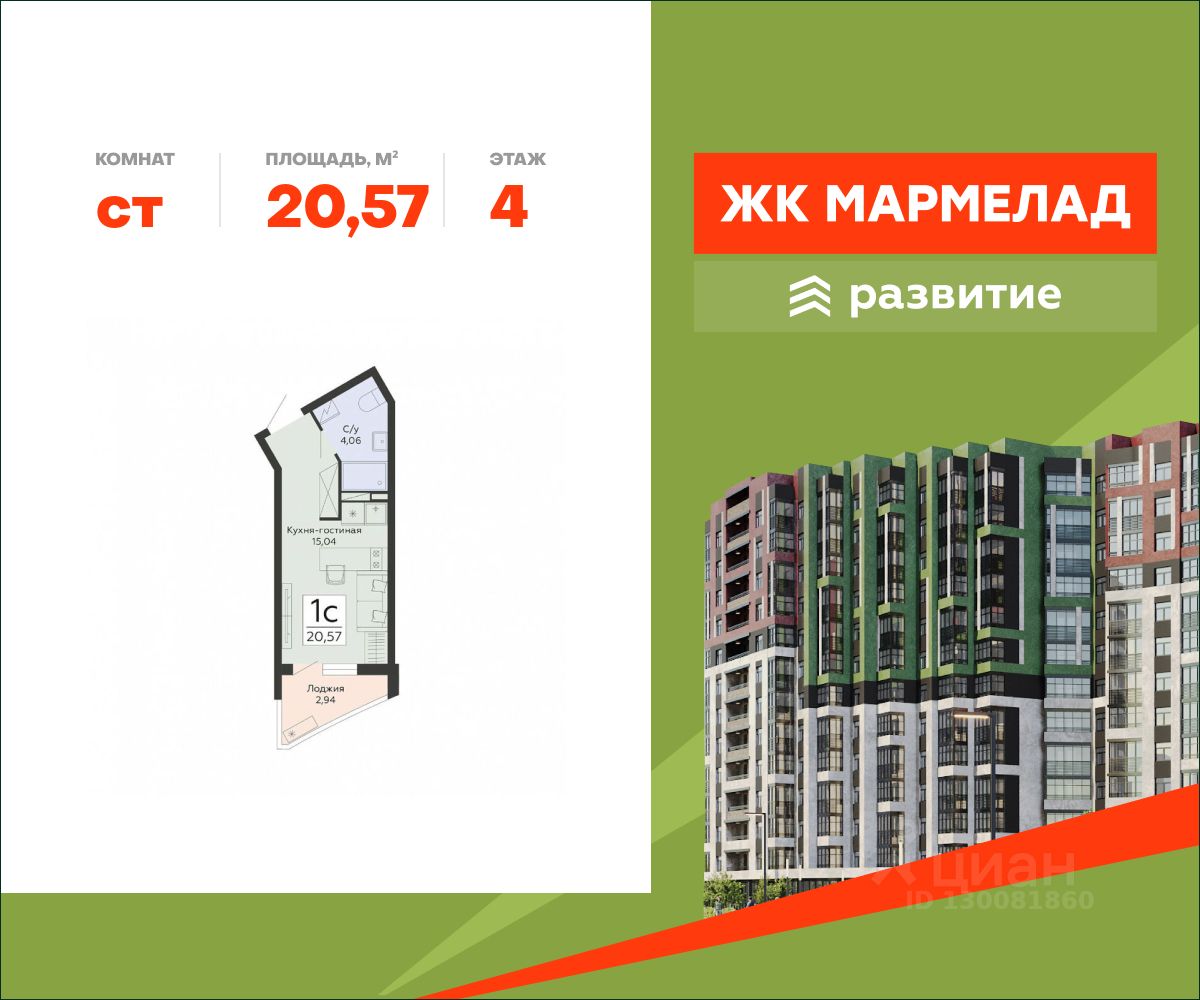 В продаже квартира площадью 20.57 кв. м с черновой отделкой. Квартира расположена на 4 этаже 13 этажного дома, в жилом комплексе комфорт-класса "Мармелад" (Федеральный застройщик - ГК "Развитие").