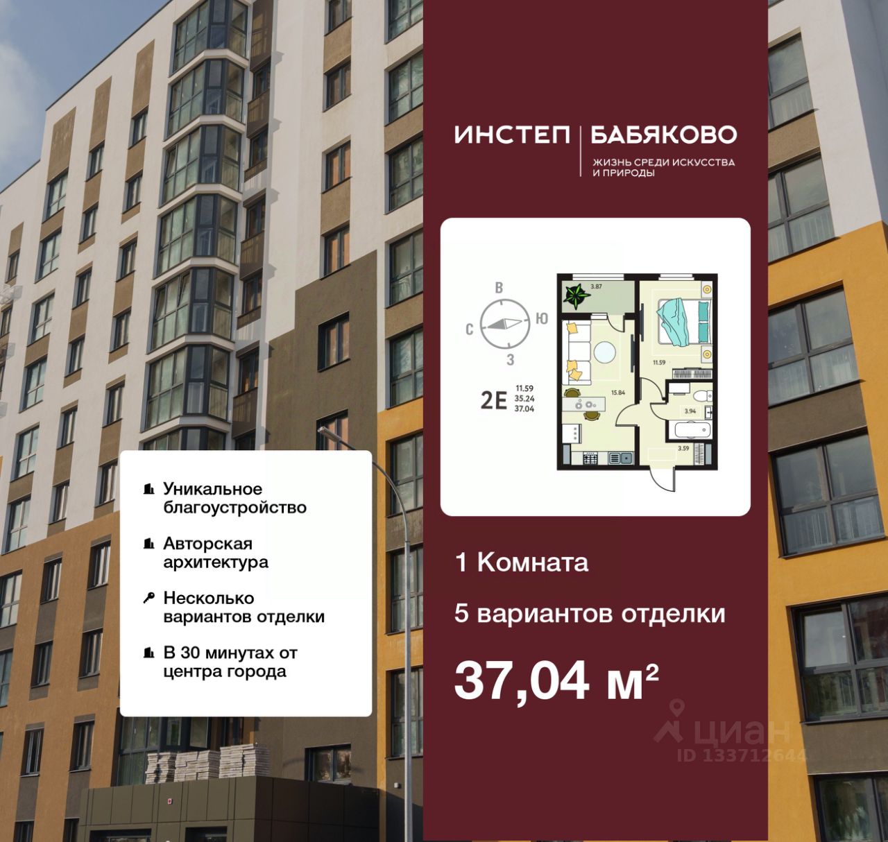1-комн. квартира в ЖК "Инстеп. Бабяково" на 4 этаже. Квартира без отделки, после оформления собственности можно делать ремонт. Общая площадь: 37.04 кв.м., жилая: 11.59 кв.м., площадь просторной кухни-столовой: 15.84 кв.м. Все окна выходят на одну сторону. В квартире одна лоджия, один совмещенный санузел. Высота потолков 2.64 м.