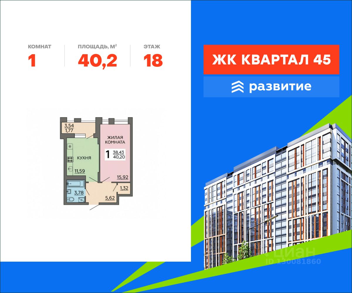 В продаже квартира площадью 40.20 кв. м с черновой отделкой. Квартира расположена на 18 этаже 18 этажного дома, в жилом комплексе комфорт-класса "Квартал 45".