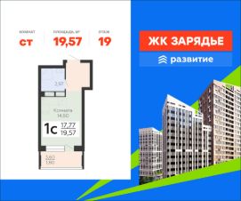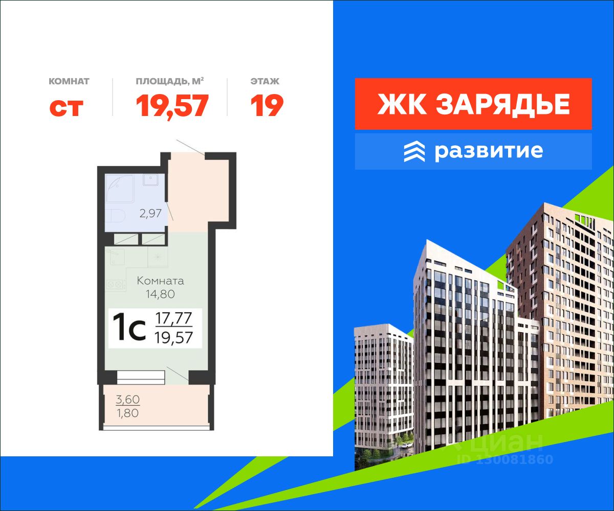 В продаже квартира площадью 19.57 кв. м с черновой отделкой. Квартира расположена на 19 этаже 23 этажного дома, в новом микрорайоне комфорт-класса "Зарядье" (Девелопер - федеральный застройщик ГК "Развитие").
