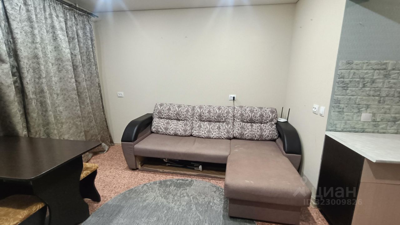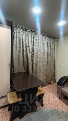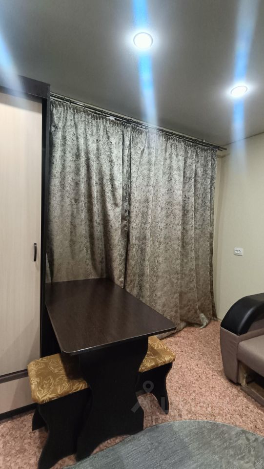 В комнате угловой диван(не раскладывается), Шкаф, стенка, стол с двумя стульями - мебель остаётся в квартире(не новая). Натяжной потолок, большое пластиковое окно, чугунная батарея, на полу ленолиум, входная металическая дверь.
