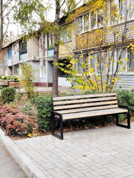 Уютный зеленый тихий двор: клумбы, асфальт и тротуарная плитка, скамьи для отдыха.