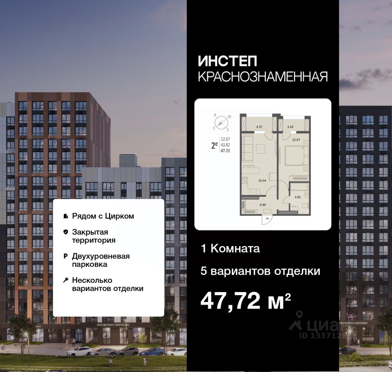 Просторная 1-комн. квартира в ЖК "Инстеп. Краснознаменная" на 16 этаже. Квартира без отделки, новый собственник может сделать ремонт по своему проекту. Общая площадь: 47.72 кв.м., жилая: 12.67 кв.м., площадь просторной кухни-столовой: 19.54 кв.м. Все окна выходят на одну сторону. В квартире две лоджии, один совмещенный санузел. Высота потолков 2.64 м.