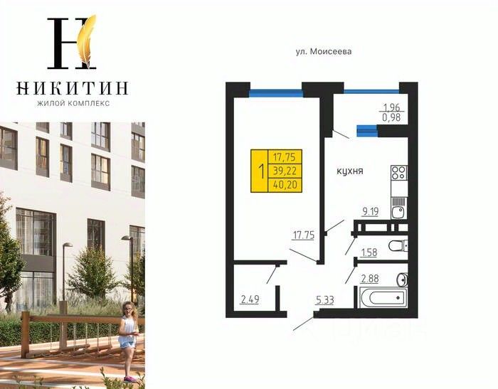 Продаётся 1-комнатная квартира в строящемся доме (Дом 2), срок сдачи: IV-кв. 2027, общей площадью 40.2 кв.м., на 4 этаже. Жилой комплекс "Никитин" расположен в Ленинском районе города Воронеж. Он представляет собой современный жилой комплекс, который включает в себя несколько многоэтажных домов, обустроенных территорию и парковочные места.