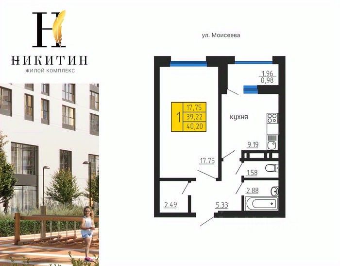Продаётся 1-комнатная квартира в строящемся доме (Дом 2), срок сдачи: IV-кв. 2027, общей площадью 40.2 кв.м., на 5 этаже. Жилой комплекс "Никитин" расположен в Ленинском районе города Воронеж. Он представляет собой современный жилой комплекс, который включает в себя несколько многоэтажных домов, обустроенных территорию и парковочные места.