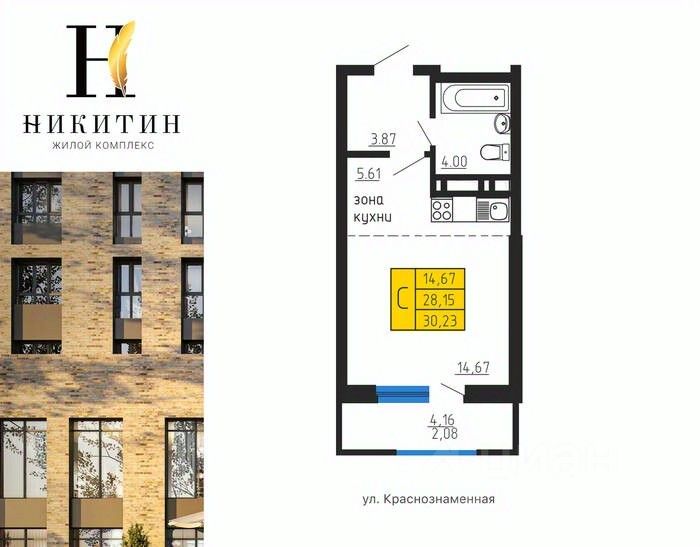 Продаётся студия в строящемся доме (Дом 2), срок сдачи: IV-кв. 2027, общей площадью 30.23 кв.м., на 23 этаже. Жилой комплекс "Никитин" расположен в Ленинском районе города Воронеж. Он представляет собой современный жилой комплекс, который включает в себя несколько многоэтажных домов, обустроенных территорию и парковочные места.