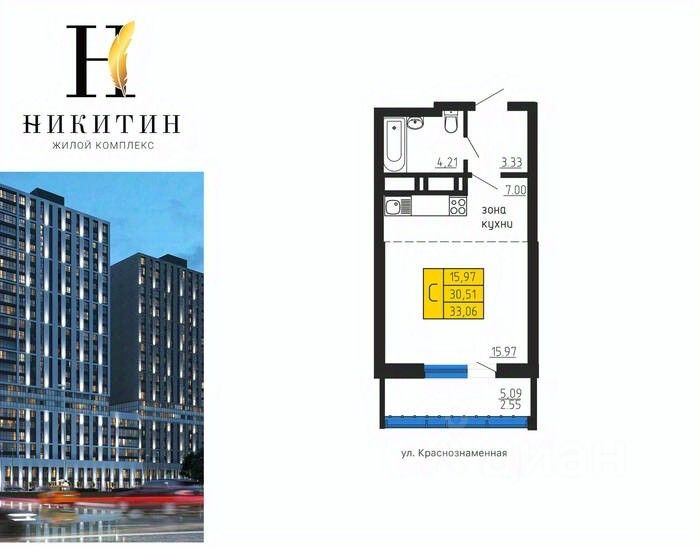 Продаётся студия в строящемся доме (Дом 2), срок сдачи: IV-кв. 2027, общей площадью 33.06 кв.м., на 21 этаже. Жилой комплекс "Никитин" расположен в Ленинском районе города Воронеж. Он представляет собой современный жилой комплекс, который включает в себя несколько многоэтажных домов, обустроенных территорию и парковочные места.