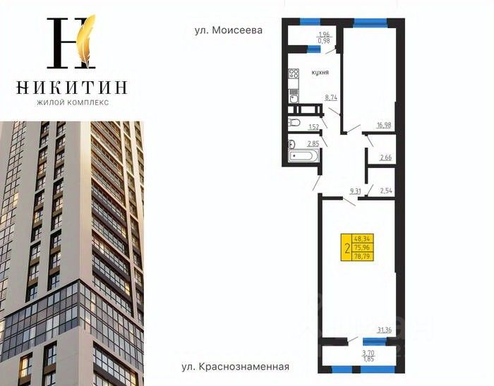 Продаётся 3-комнатная квартира в строящемся доме (Дом 2), срок сдачи: IV-кв. 2027, общей площадью 78.79 кв.м., на 22 этаже. Жилой комплекс "Никитин" расположен в Ленинском районе города Воронеж. Он представляет собой современный жилой комплекс, который включает в себя несколько многоэтажных домов, обустроенных территорию и парковочные места.