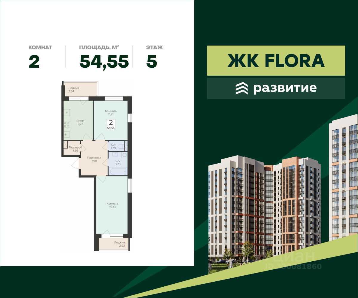 В продаже квартира площадью 54.55 кв. м с черновой отделкой. Квартира расположена на 5 этаже 17 этажного дома, в жилом комплексе комфорт-класса FLORA ("Флора").